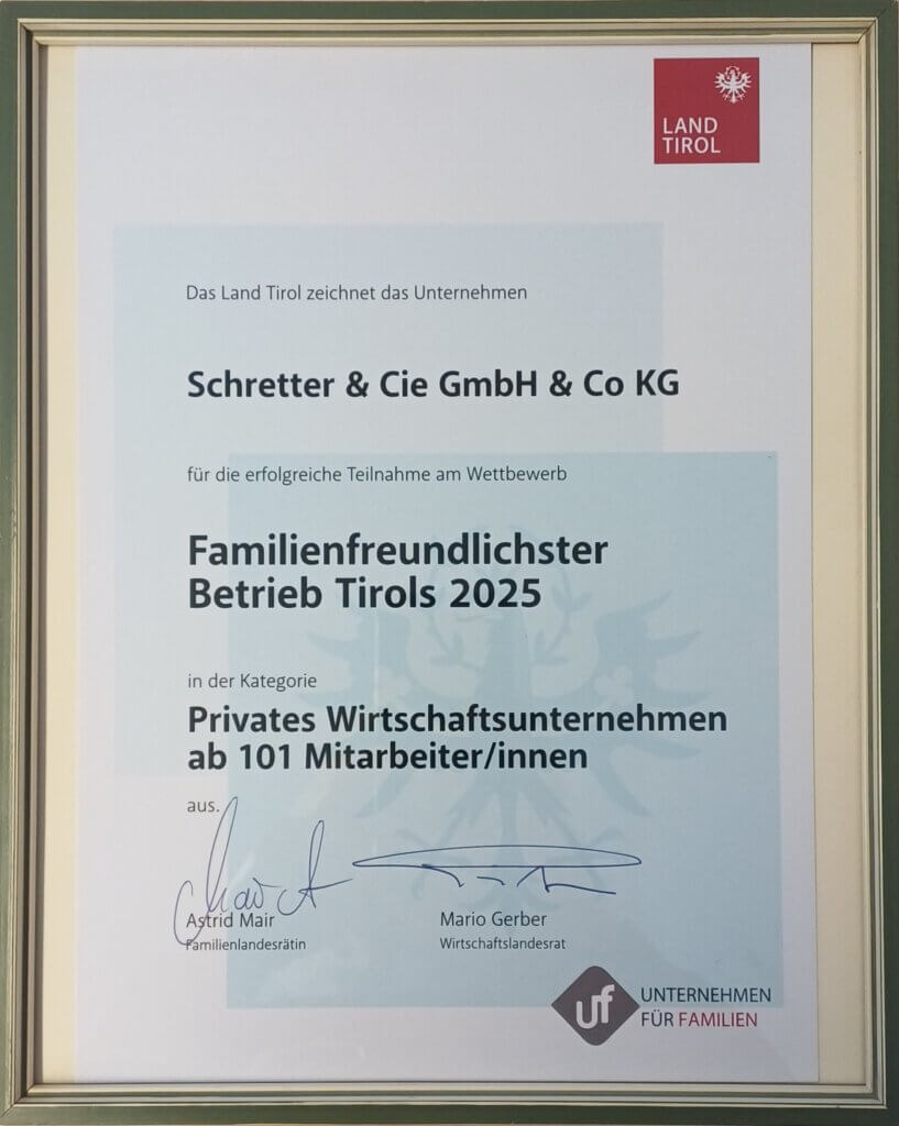 Im Jahr 2025 haben wir wieder erfolgreich am Landeswettbewerb „Familienfreundlichster Betrieb Tirols“ teilgenommen. Im Rahmen dieses Wettbewerbs konnten wir unsere Familienfreundlichkeit und die Vereinbarkeit von Beruf und Familie als Teil unserer Firmenphilosophie hervorheben. 😃